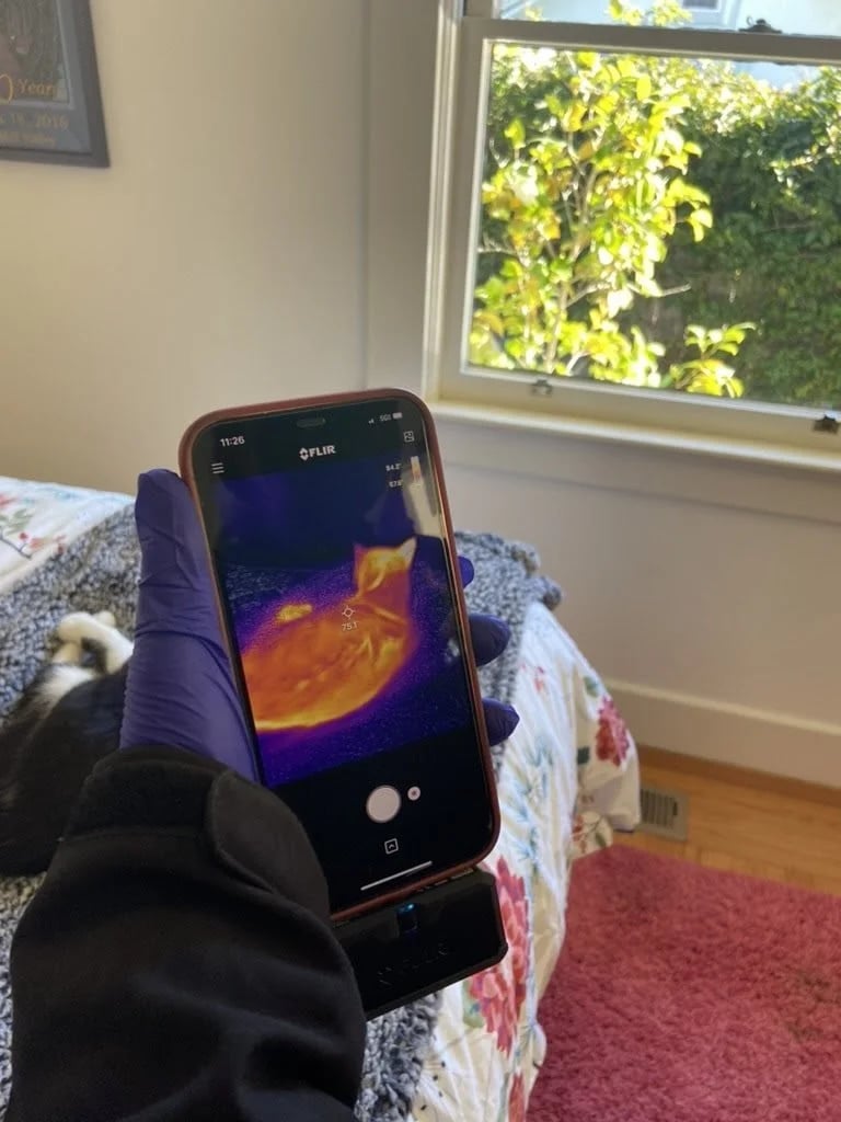 In addition to creating a thermal map of the interior wall surfaces of our house (and a bonus map of my cat), Mickey did a door blower test to check for air leaks coming through gaps in the ceiling, windows, walls and floors. Removing old insulation, sealing air gaps, and replacing it with better rated insulation improves comfort and efficiency and earns you energy rebates. Our house was better sealed than we predicted and while the insulation in our attic could be improved, we have to question if it’s worth it to remove it to do the air sealing, since it would end up in a landfill. Luckily, Mickey’s final report will tell us the most environmentally responsible way to go.