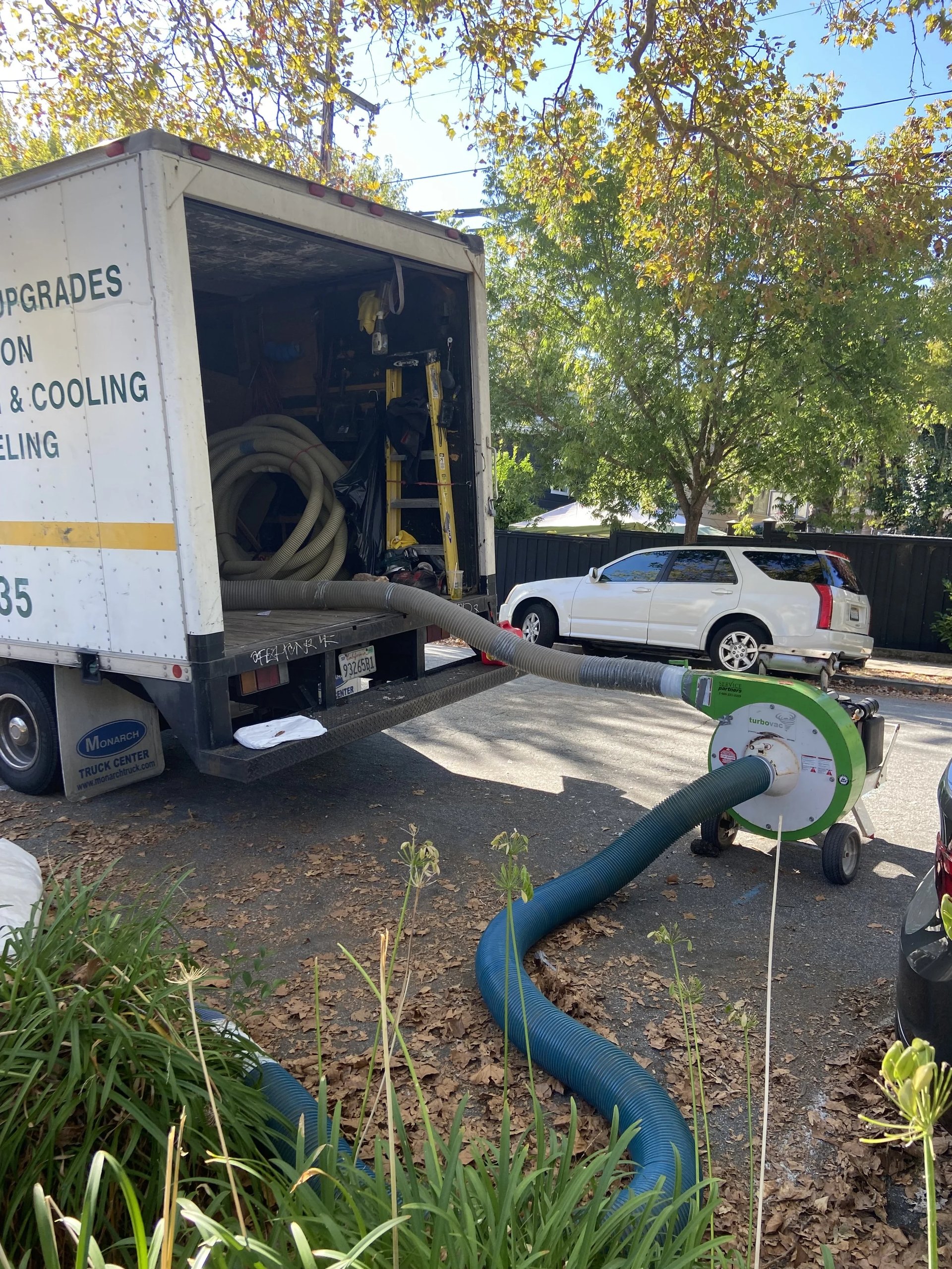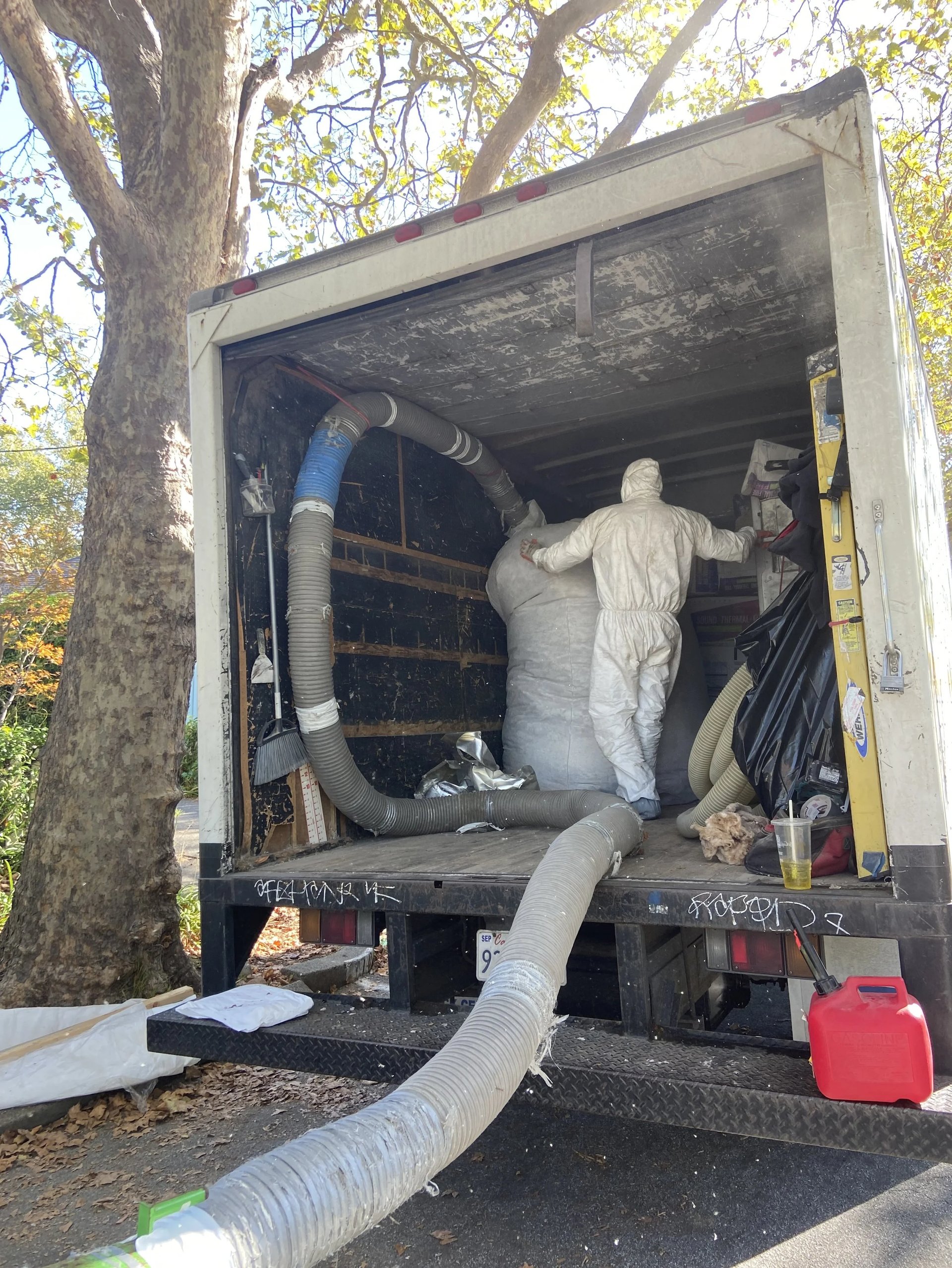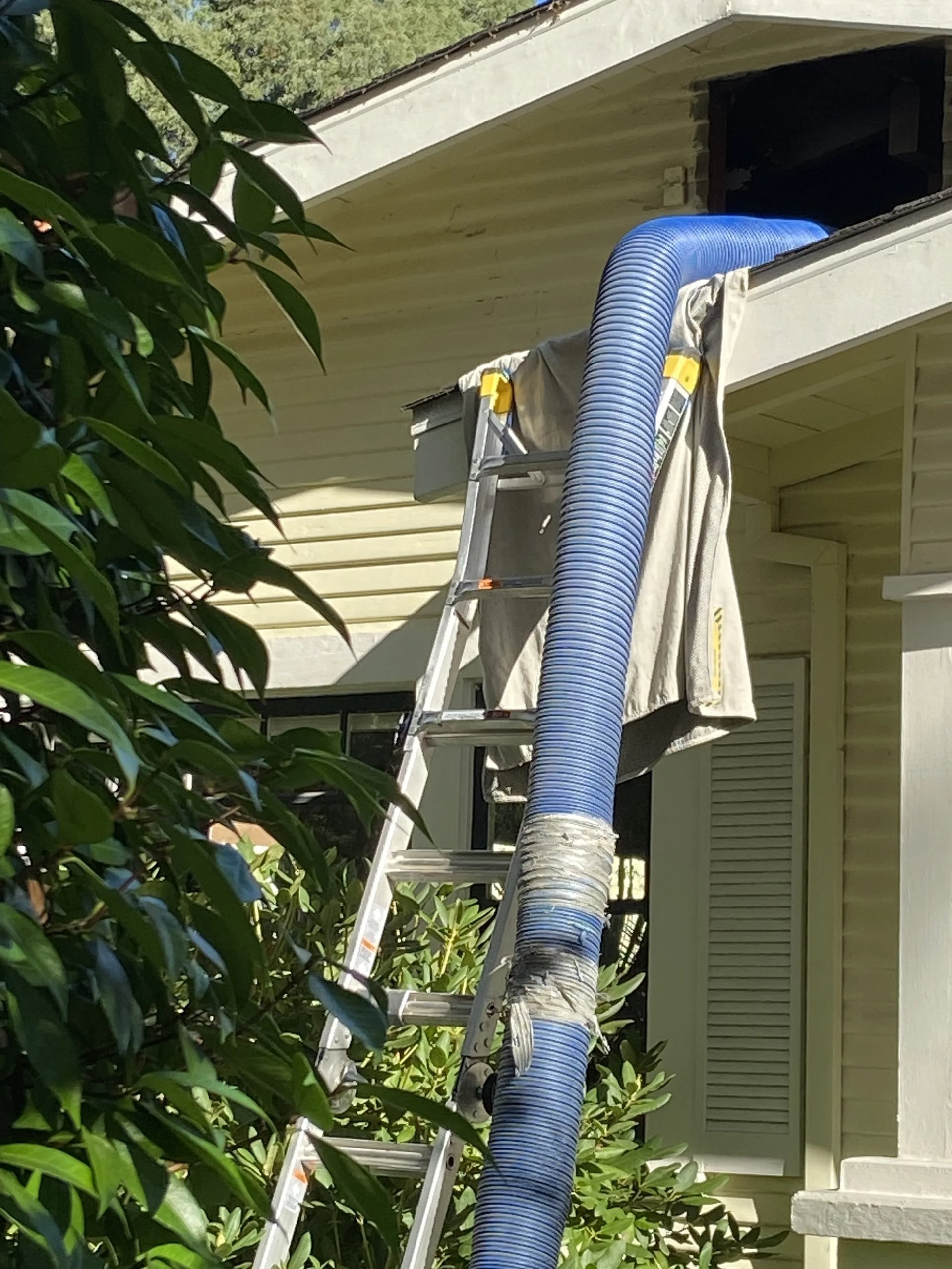The day after PorchFest the team from Building Efficiency arrived to start the air sealing and insulation phase. Using a gigantic vacuum, they removed all the existing attic insulation and sealed the air gaps between the attic and the living space. Next, they installed a whole house fan, designed to draw in cooler evening air and exhaust warm air to quickly cool down the house after warm days.
