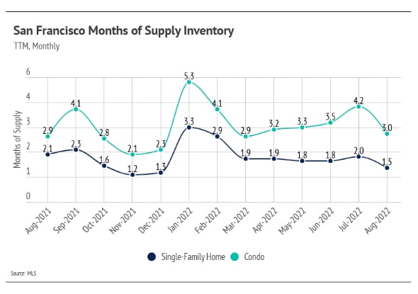 The Months Supply of Inventory (MSI) quantifies the supply/demand relationship by measuring how many months it would take for all current homes listed on the market to sell at the current rate of sales. An MSI lower than three favors sellers, while higher than three favors buyers. The MSI for San Francisco condos is at three, down from a peak of 5.3 in January of 2022, while single family homes have an MSI of 1.5 - still a strong sellers market. Marin has a similar story, with prices down from the peak in April, 2022 but starting to slowly climb again as we move into our fall selling season. Inventory remains a big issue, with a 30% decrease in the number of sales reflecting a decrease in the number of homes available. Still, Marin remains firmly a sellers market, with an MSI of 2.2 for condos and 1.2 for single family houses.