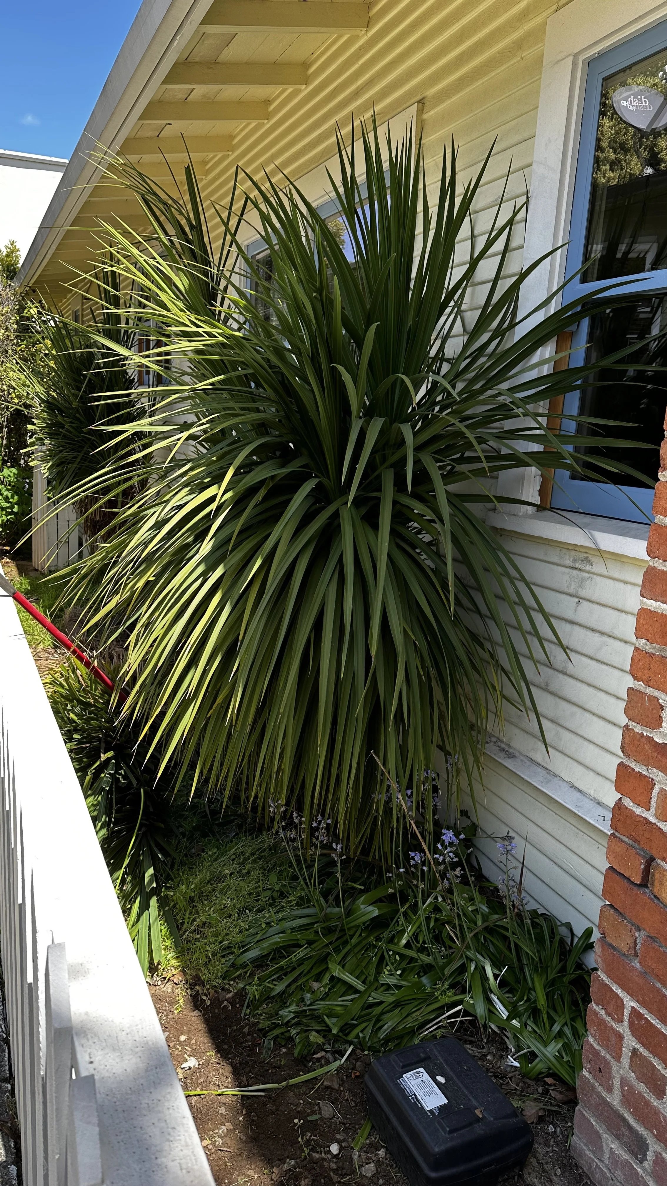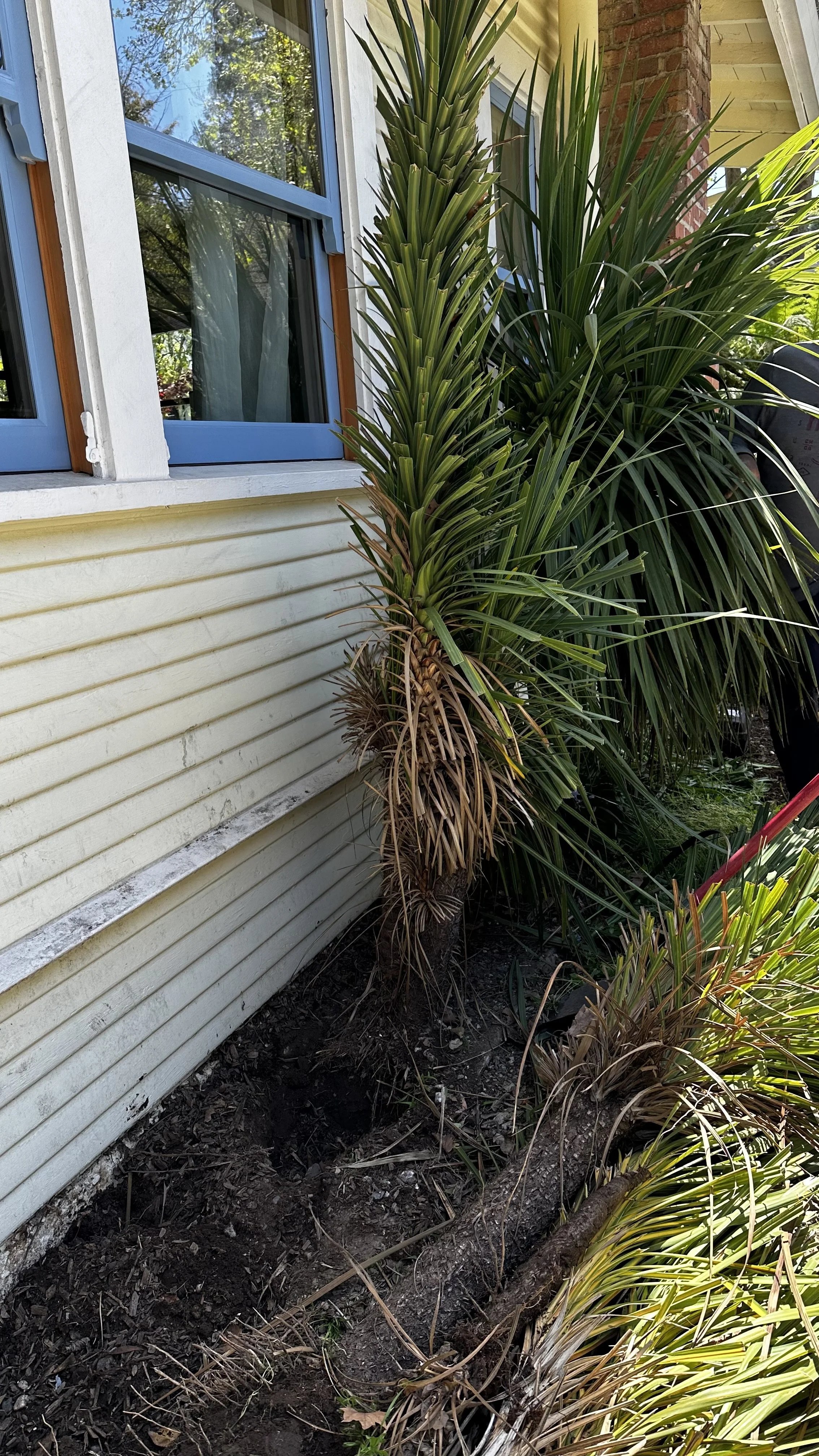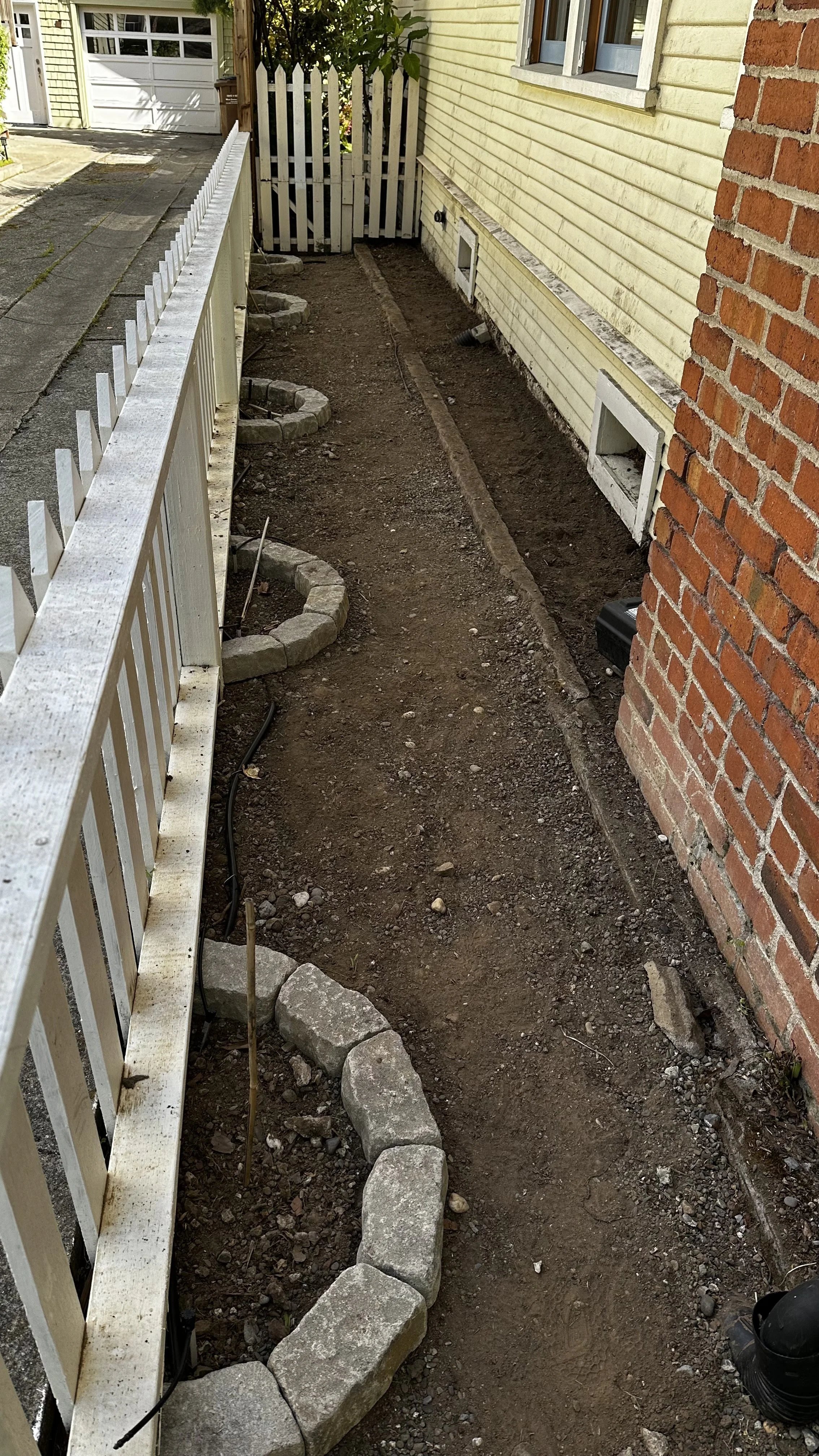 We took a break for the first couple of months of the year but our next project is now underway. A previous owner planted large palm trees just a few feet from our foundation on the west side of the house. While they provide privacy and shade from the afternoon sun, they are far too large for their location and are causing problems with the windows, siding and roof gutters. The local defensible space ordinance requires a buffer between plants and structures. The palm trees have to go. We started by digging way down to extract the roots. Then we created planting areas and added drip irrigation for climbing rose bushes that will go along the picket fence. Finally, we are moving the gravel pathway from the fence side of the passage to the house side, creating a buffer zone to mitigate the fire hazard. My first thought was yellow roses to match the house, but now I’m thinking a blush pink instead. What do you think?