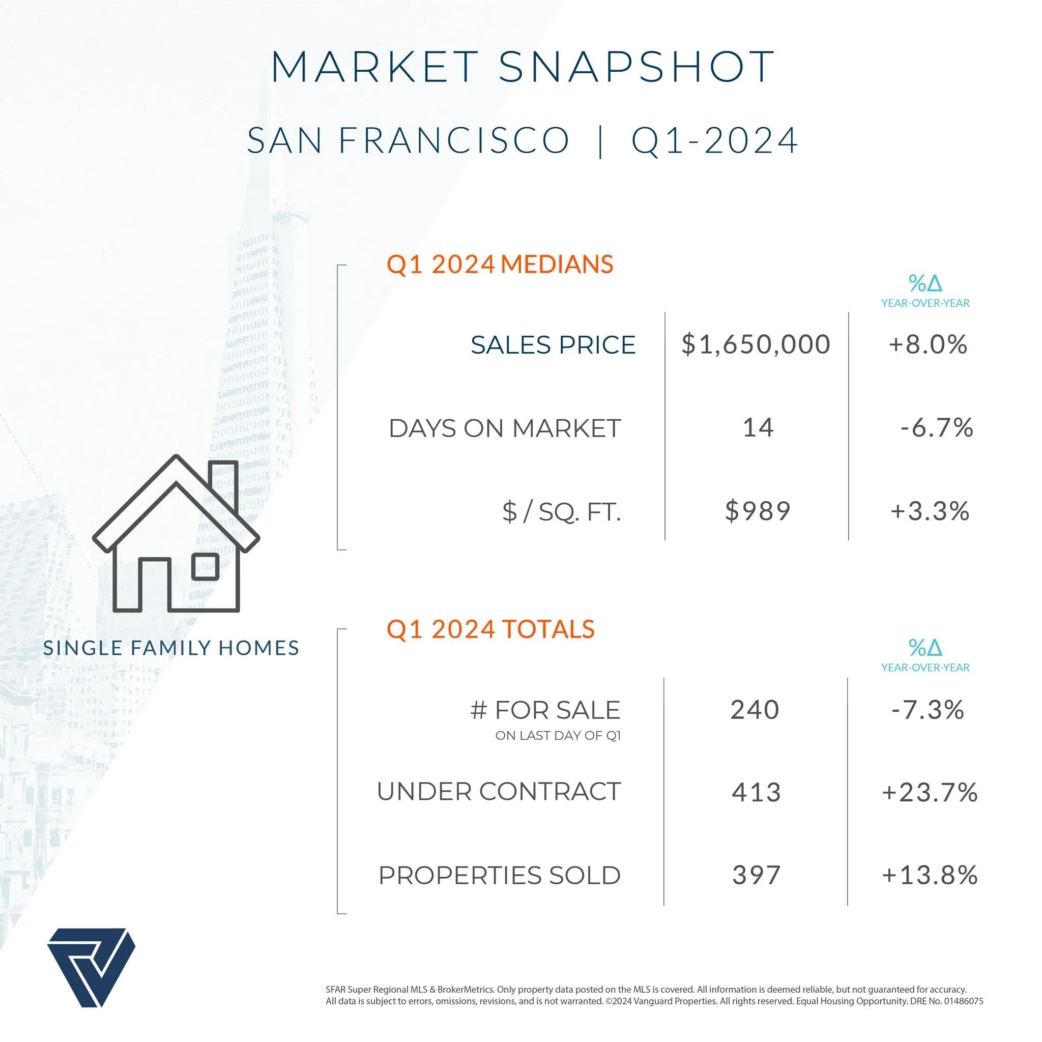 Things are hot out there! In the last three months single family homes and condos in San Francisco have displayed robust growth across key metrics, including median sales price, median price per square foot and the overall number of sales. The average number of days on market has dropped, indicative of heightened demand and efficient sales processes. The spring has brought a surge in buyer activity, with significant turnout at open houses and many homes receiving multiple offers. Despite mortgage rates continuing to show little downward movement, properties are selling well above asking price with multiple offers on each property becoming the norm.