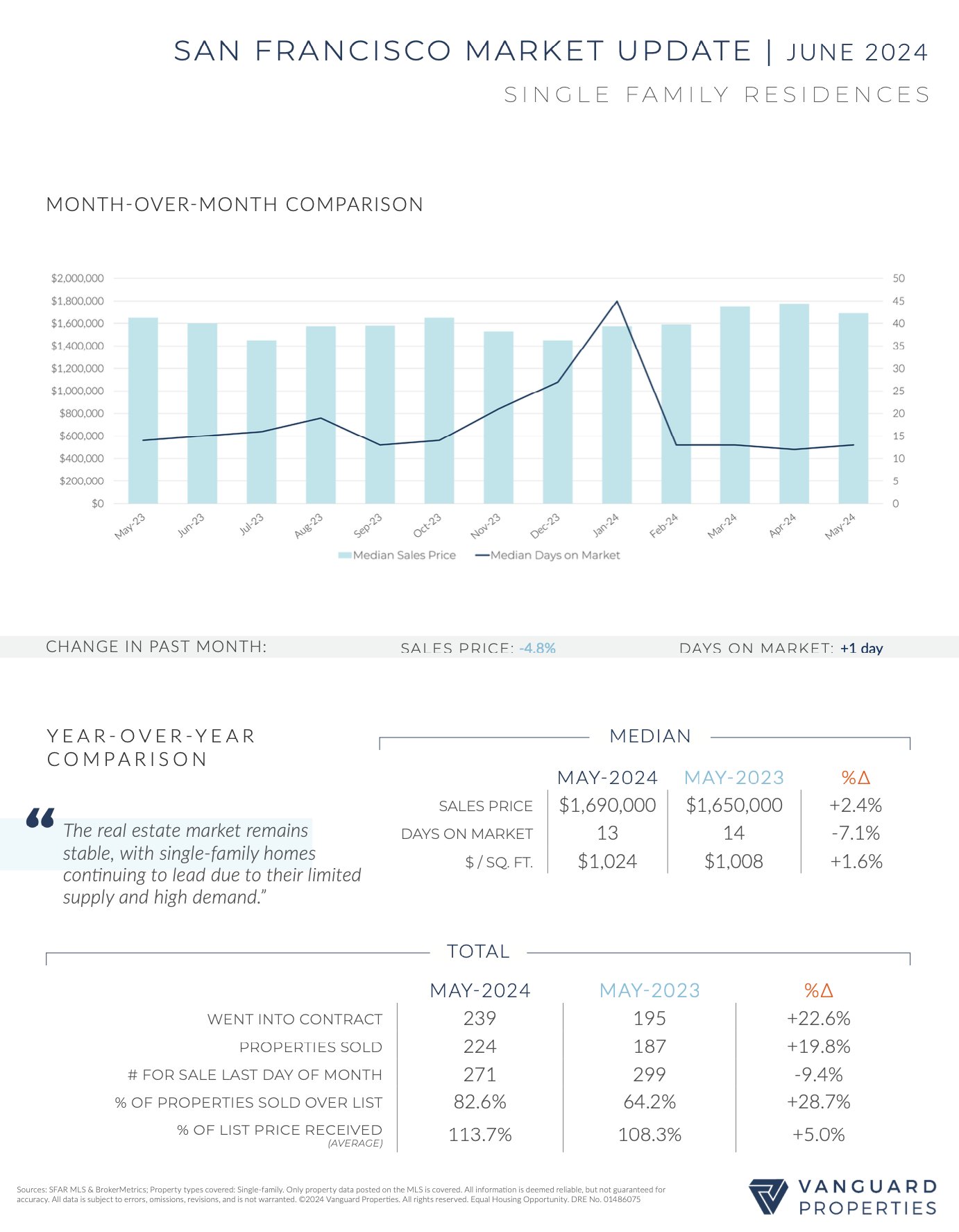 Despite the sticking power of high interest rates, prices have remained relatively steady, even climbing a bit in San Francisco particularly for single family homes. In Marin, the market remains stronger than it was a year ago with more sales and more homes on the market. However, a decrease in the number of homes selling for over the asking price correlates with a lower number of homes receiving multiple offers. Single family homes in San Francisco are selling strong as always, due to the limited number and high demand. Condos in desirable locations and within a reachable price range are also selling well. Those at higher price points are facing challenges between high monthly payments and higher HOA fees in some of the buildings.