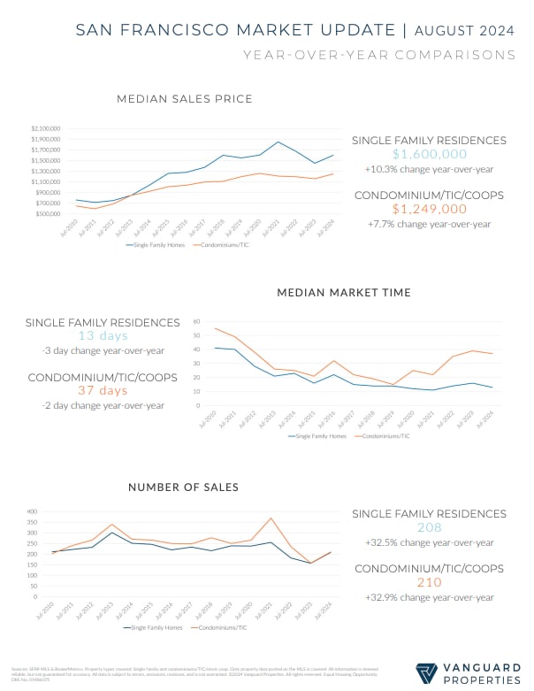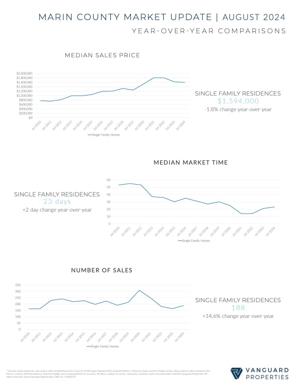 We’ve seen an interesting divergence between the San Francisco and Marin markets this August. In San Francisco the number of home sales jumped 32.5% over the previous year. The median price for single family homes was up 10.3%. Not only are homes selling for more, they are selling faster. The median days on market decreased to just 13, while 3 out of 4 homes sold for over their list price at an average of 111.2% of asking. This trend highlights strong buyer demand. With interest rates dropping, we can imagine that this will only grow as we head into our typically busy fall season. By contrast, the market in Marin has slightly softened, with average prices down about 1.8% year over year. More price reductions were seen in the past month than any time in the last 2 years, indicating that sellers are adjusting to market shifts. Still, 40% of homes sold for over their asking prices, with an average of 100.6% over asking.
