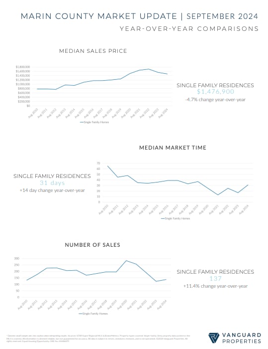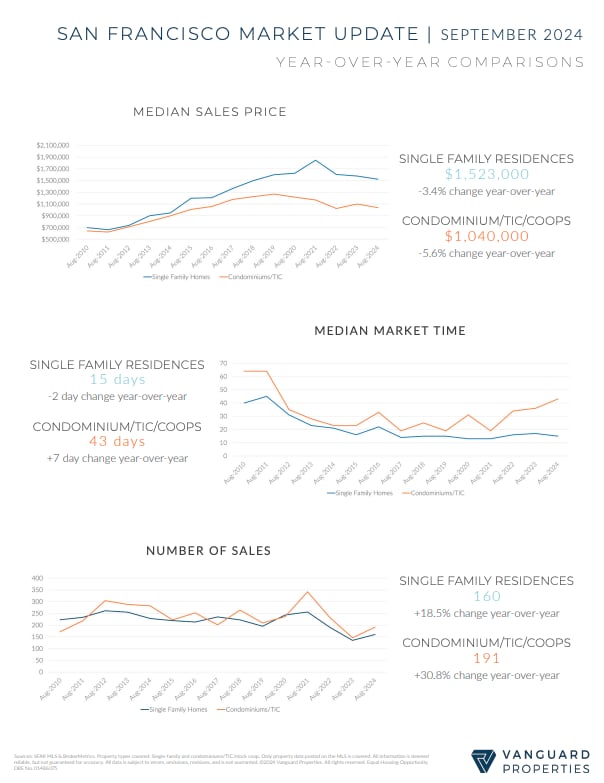The biggest news in September is that interest rates finally dropped! On September 18th the Federal Reserve dropped the interest rate to 4.83%, down from 5.33%. What does this mean for mortgage interest rates? This week I saw 5.625% for a 30 year fixed rate conforming loan, which is great. Not only that, but forecasters are predicting a federal rate drop to 3.4% by the end of 2025. We’ve seen a commensurate uptick in homes coming on the market and buyers actively looking and writing offers. September is typically a busy month in real estate, second only to the spring, and this month is shaping up nicely. Year over year, prices have softened a bit. Single family residences are down about 3.4% in San Francisco and 4.7% in Marin, while TICs and condos in San Francisco are down about 5.6%. With the increase in market activity we’ll see how the statistics are impacted next month.
