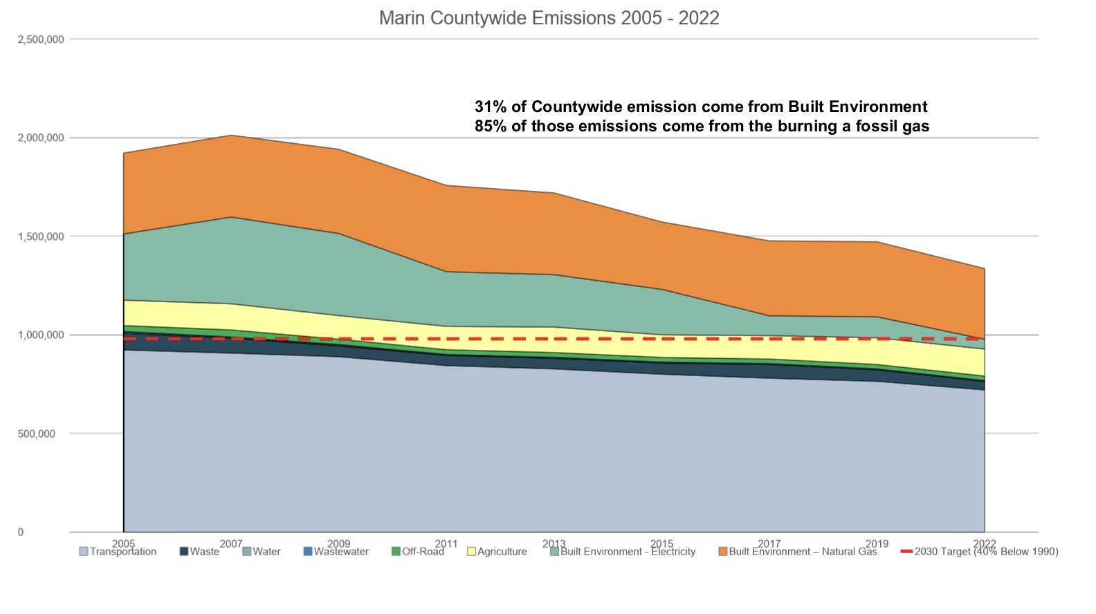 Jurisdictions throughout the Bay Area are working on plans to cut carbon emissions and meet California’s ambitious plan to be net-zero by 2045. Marin County’s Sustainability Team recently launched the Electrification Roadmap to transition to an all-electric and energy efficient future with a target of reducing emissions by 2030 to 40% of 1990 levels. As you see in the graphic above, 31% of the county’s carbon emissions come from the built environment and 85% of that comes from burning a fossil gas. While the use of electricity to power our homes has gotten cleaner due to wind and solar energy, emissions from burning natural gas have been largely unchanged. Electrifying your home not only gets us closer to our statewide goals but improves your indoor air quality and can lower your energy bills. Want to get started? Click on the buttons below to link to the resource hubs for Electrify Marin and the San Francisco Environment Department.