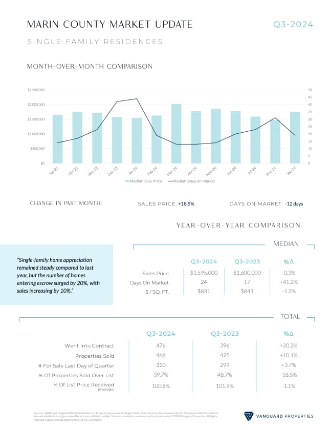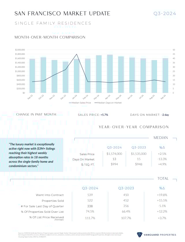 The 2024 third quarter report came out in the second week of October. The month started with quite a bit of positive energy coming from falling interest rates, a volatile but ultimately positive stock market, and the lowest inflation in over 3 years. In San Francisco homes experienced a 2.5% increase in sales price, a 4.9% increase in price per square foot, and a 12.5% increase in the total number of homes sold. In the condo market, which has been slow for quite some time, sales increased 14.6% compared to last year. In Marin prices remained steady but the number of homes entering escrow increased by 20%. Currently we are in a bit of a holding pattern as the whole country seems to be holding its breath about the election. Whether you are glued to the news or taking a self-care media hiatus I wish us all, and the planet, the best of luck next week. Click the buttons below to read the Market Updates from Vanguard Properties.