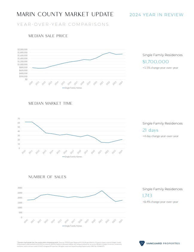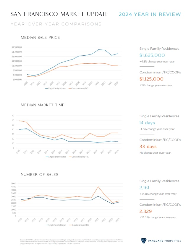 The Bay Area real estate market in 2024 reflected a mix of resilience and recovery amid broader economic challenges. High prices, limited inventory, and steady demand defined the landscape, with certain neighborhoods continuing to perform well despite a shifting economic backdrop. In some areas the tech industry’s 20% workforce reduction since 2022 had a lingering impact on housing demand, however, year-over-year data showed encouraging signs of recovery. Sales of single-family homes rose 8.4% in Marin and 14.8% in San Francisco. Median sales prices and price-per-square-foot also saw modest gains, reflecting renewed buyer activity. The luxury segment ($3M+) also experienced healthy growth, supported by strong demand. Competitive bidding remained common, especially in desirable neighborhoods, with many properties selling quickly and above asking price. Mortgage rates have edged upward over the last four weeks with the 30-year fixed rate averaging 6.93%. Despite higher rates, buyers appear to be re-entering the market, as pending home sales continue to rise. Projections point to a seller’s market throughout 2025 characterized by tight inventory and sustained demand—conditions likely to support high pricing. The National Association of Realtors forecasts a 2% increase in home prices nationwide, driven by stabilizing mortgage rates and improving job and income opportunities.