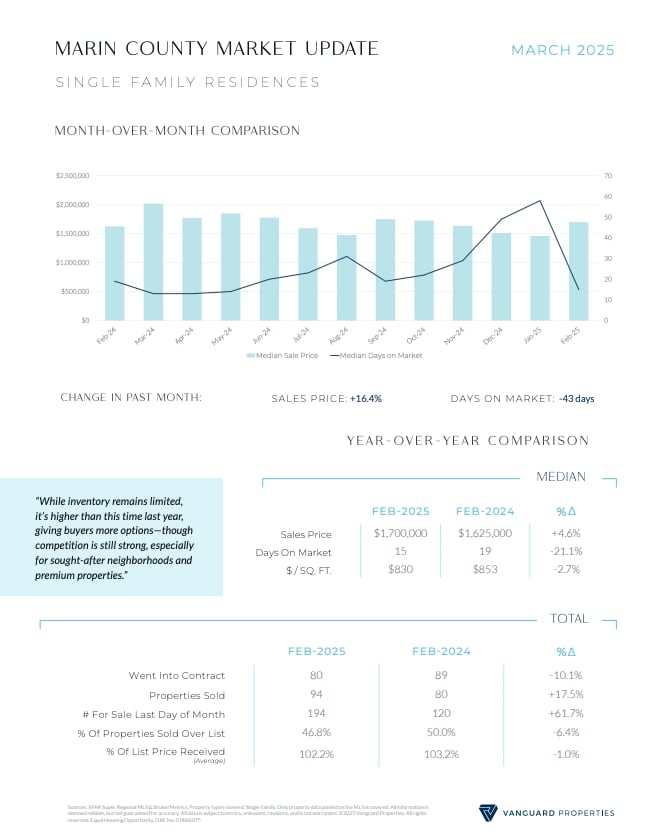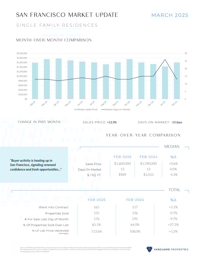 The market is picking up quickly in both Marin and San Francisco, signaling renewed confidence and fresh opportunities for both buyers and sellers. In Marin County the number of sold listings is up 17% over a year ago while San Francisco is up about 5%. One reason for lower San Francisco sales is less inventory. Months Supply of Inventory (MSI) is a key metric to determine whether the market favors sellers or buyers. An MSI of 4 - 6 indicates a balanced market. A seller’s market generally exists when the MSI is below three months. Currently, San Francisco single family homes stand at 1.3 months, a clear seller’s market, while condos are at 3.4 months, closer to a balanced market. Marin stands at about 2.4 months so while sellers still hold the advantage, buyers are seeing more options than before. With news about tariffs and a fluctuating stock market there continues to be some economic uncertainty, but falling mortgage rates are giving buyers a boost. Last week Freddie Mac reported that the 30 year fixed rate mortgage saw its largest weekly drop since September, motivating more buyers to get into the market.