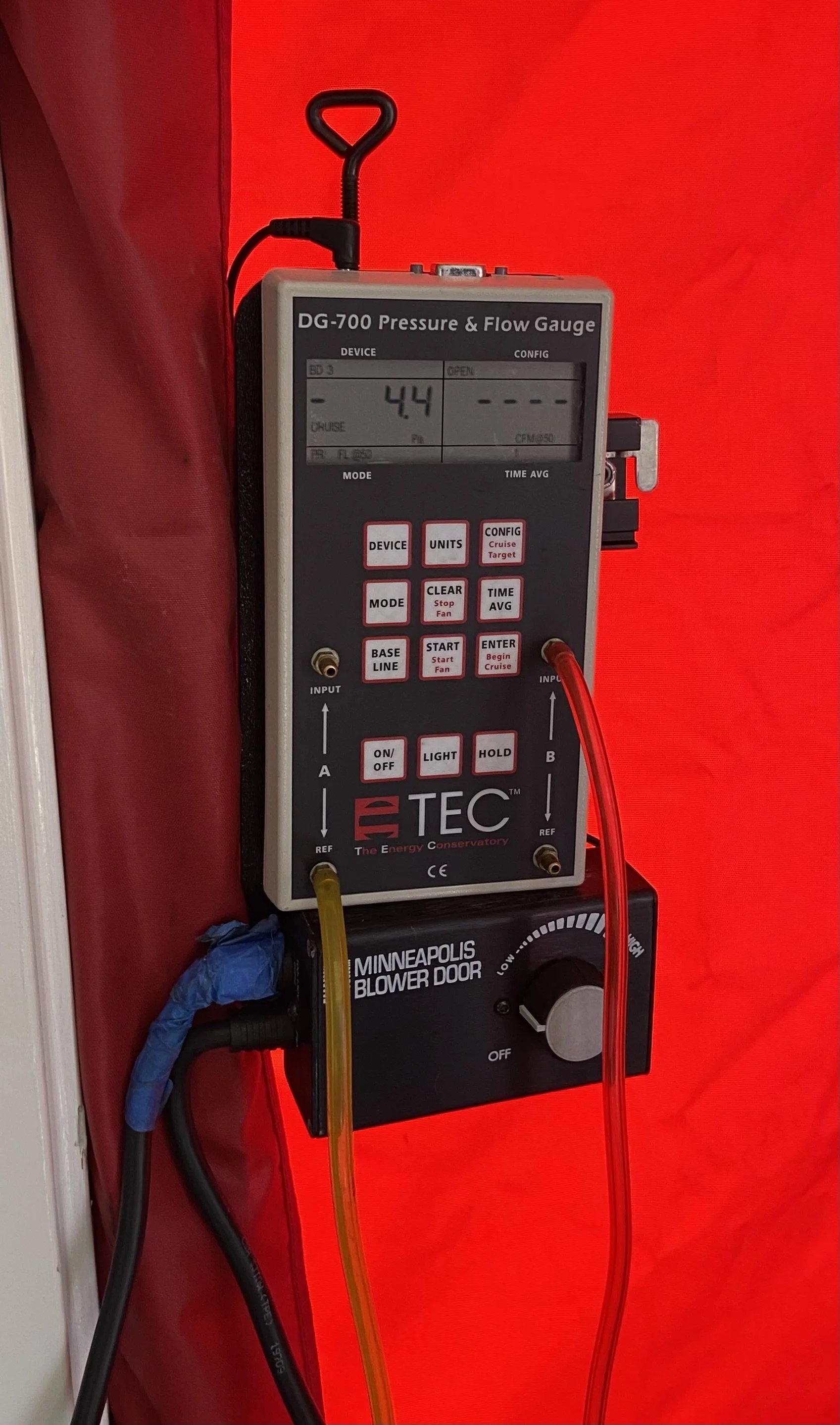 The Blower Door Test helps determine the air tightness of the house. It’s an important metric for getting rebates, as you have to demonstrate that your energy improvements increased the efficiency of your house. Our score was 2906 CFM. I’ll have to talk to Mickey to find out what that means!