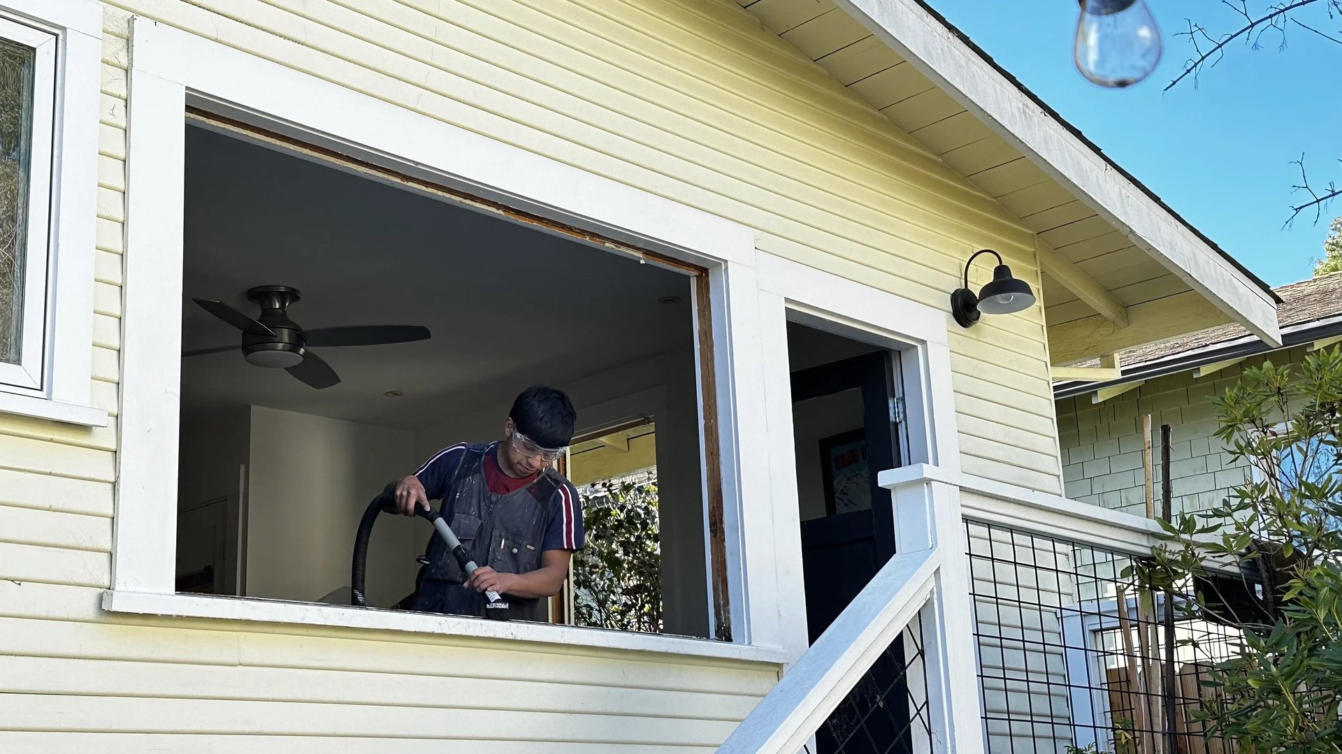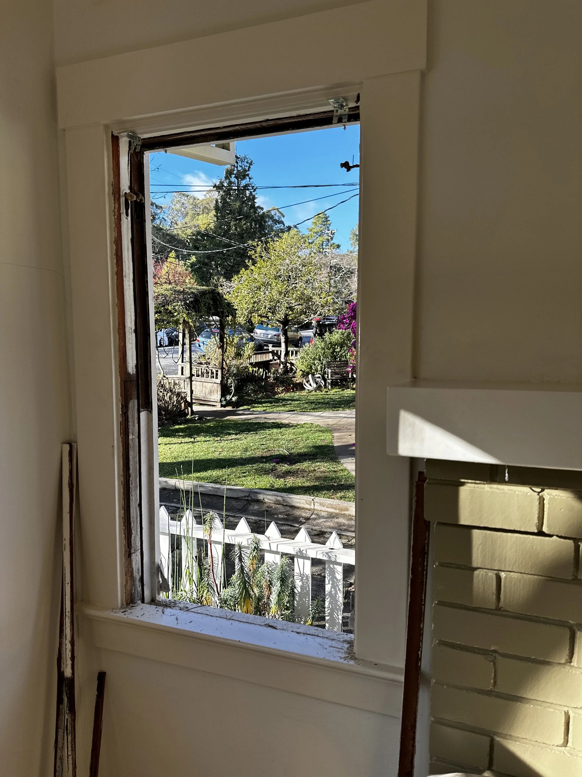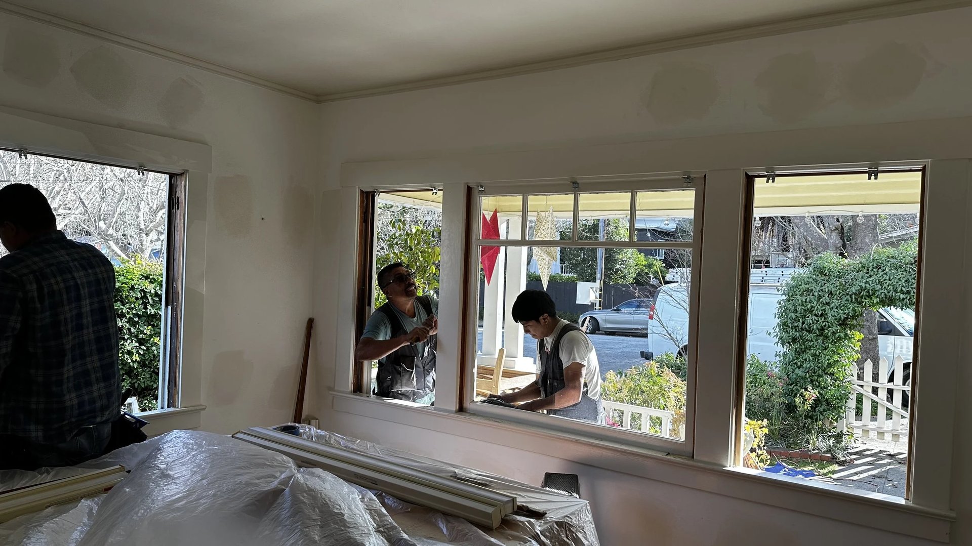 And they are beautiful! It took a long time from start to finish, but our new windows are in and we couldn’t be happier with the outcome. Avid readers of the Green Realtor News will remember our visit, back in May, to the San Pablo shop of Wood Windows and Doors. After considering all the available options for vinyl, fiberglass, and pre-fab wood windows, we decided to go with custom-made wood made by Ivan and his team in San Pablo. They could replicate the design of our original windows, preserving the historic character of our house while adding energy-efficient, double paned glass. Because each window is built for its particular frame, they are able to keep the original redwood framing and trim, replacing the sashes only. Here’s a few photos of the installation in progress.
